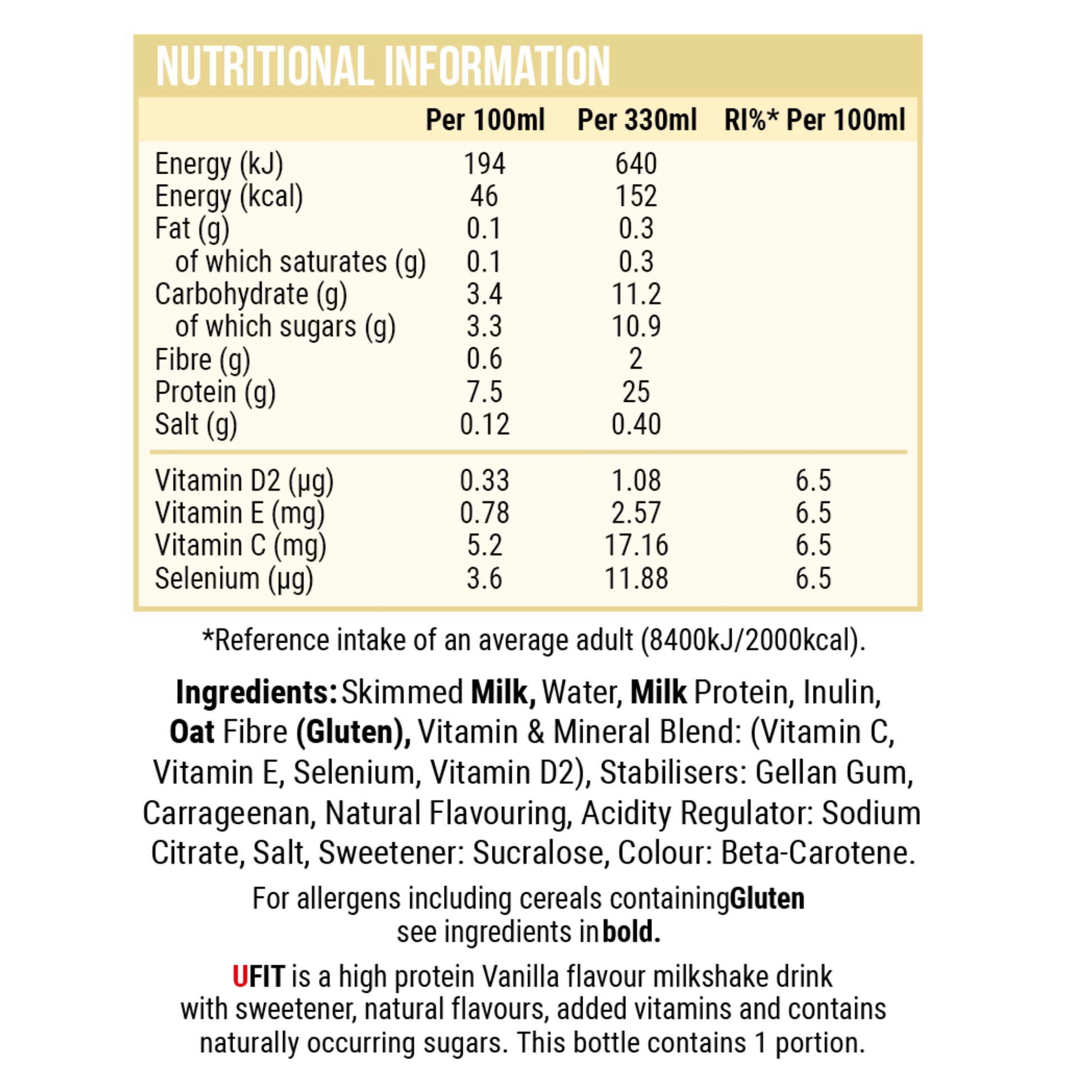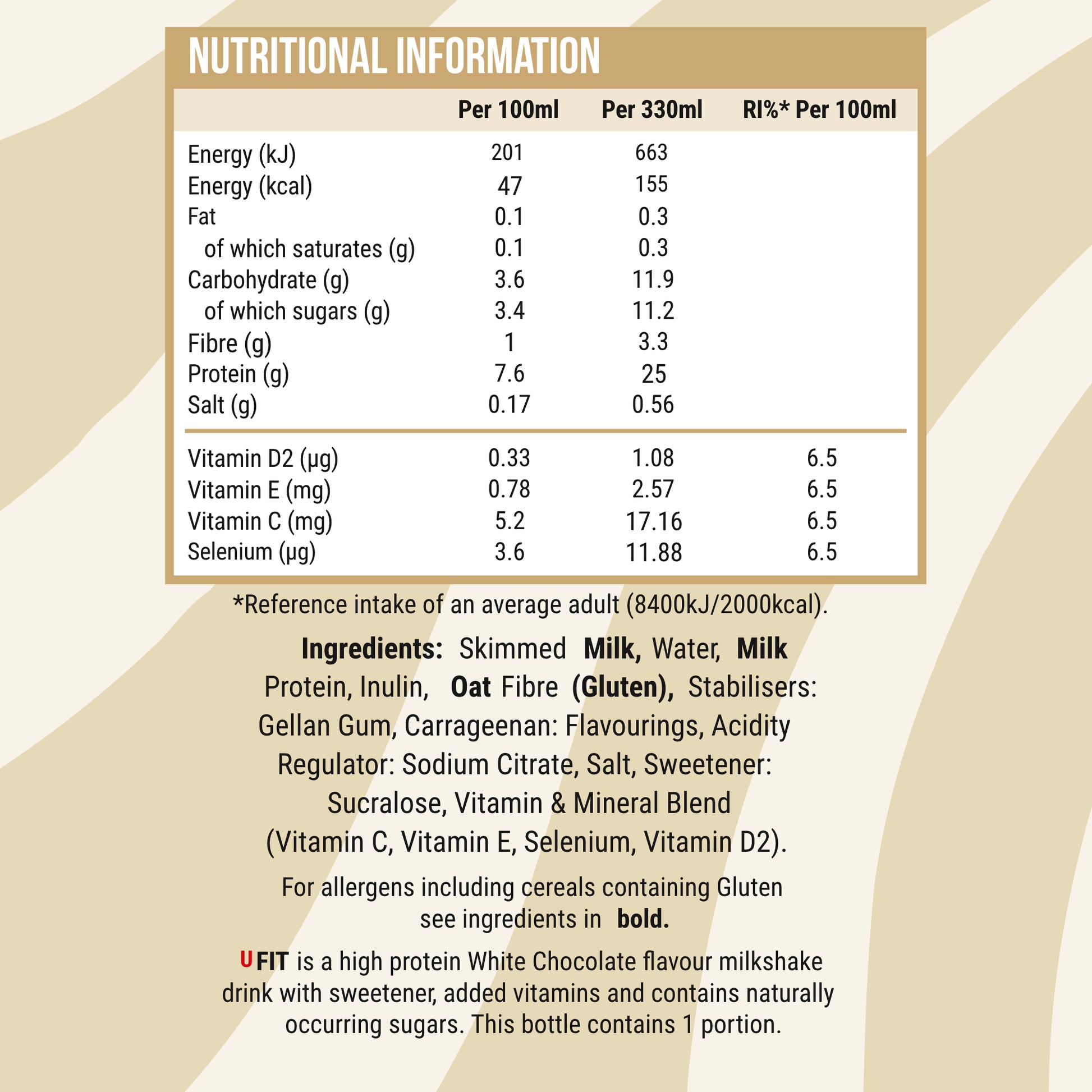 UFIT 25g is our best selling ready to drink range and has been specifically formulated to support the needs of a busy, active-ish lifestyle. Each bottle is bursting with flavour and packed with 25g of protein, it’s the ideal on the go, high protein snack.